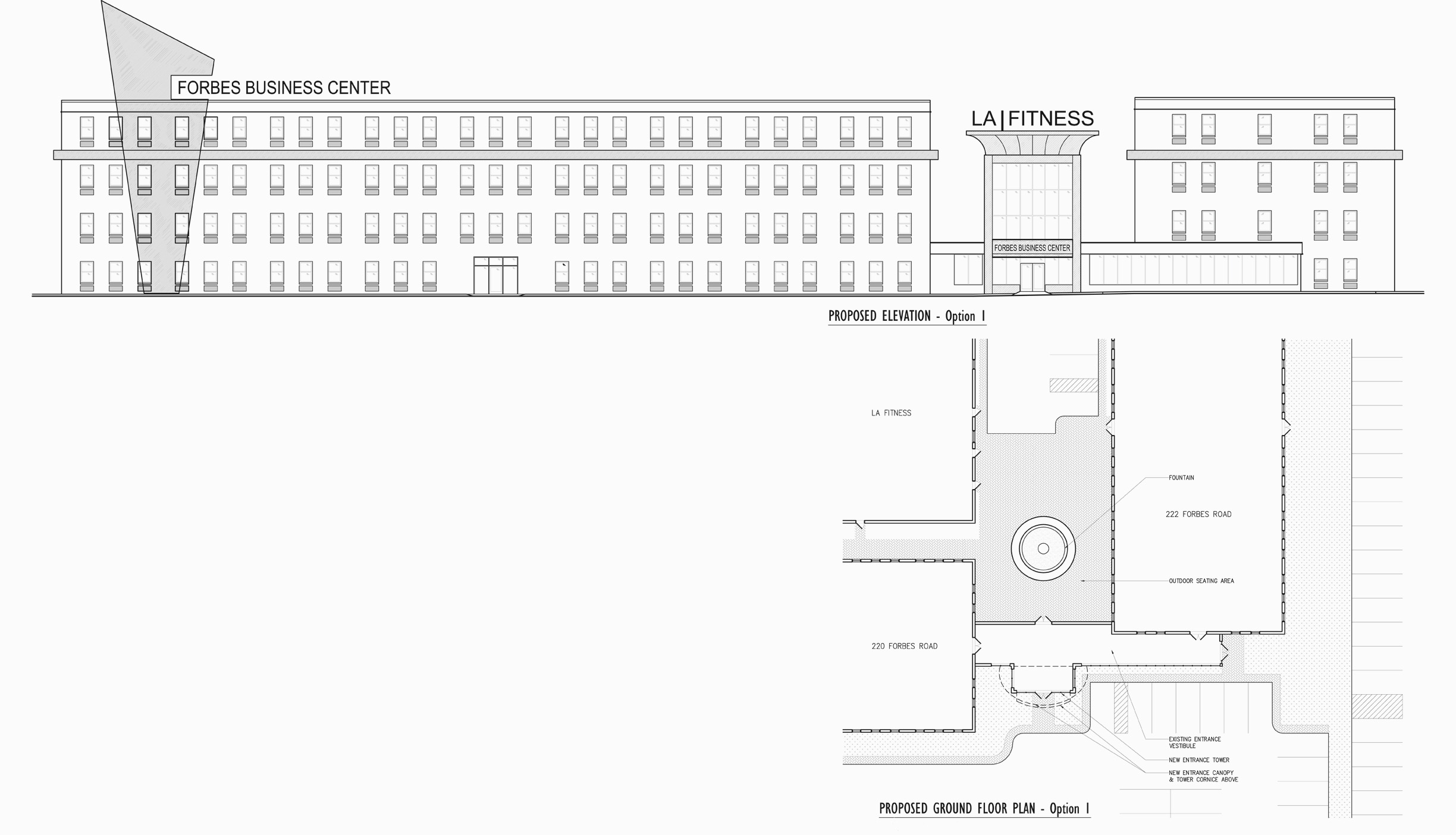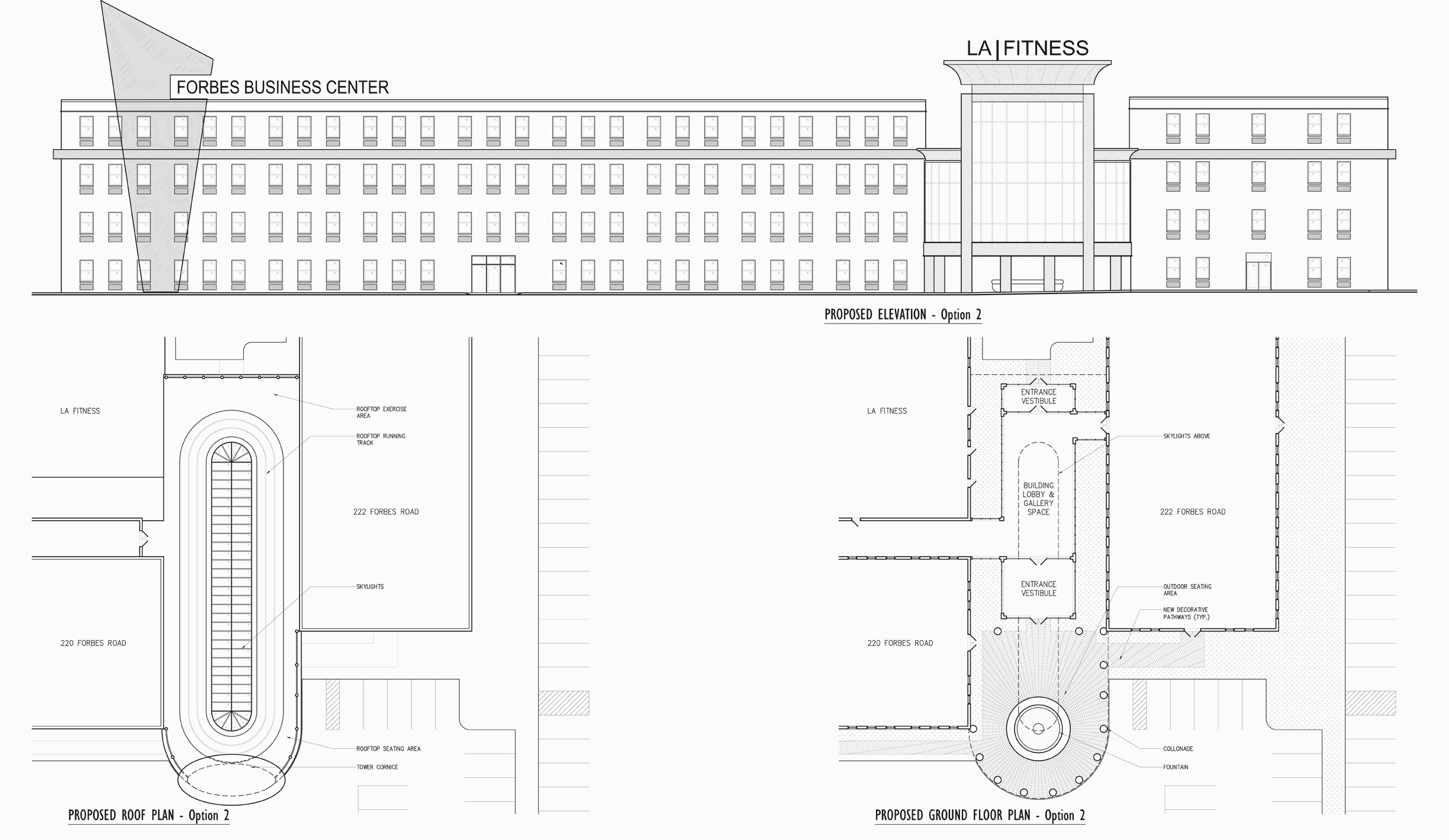 An existing one-story 34,000 sf building located off Route 93 in Braintree. The conceptual design for this project included creating two stories of running tracks, one located on the additional roof between the existing four-story buildings. The dynamic new entrance and ground floor level includes a generous concourse linking the three buildings.